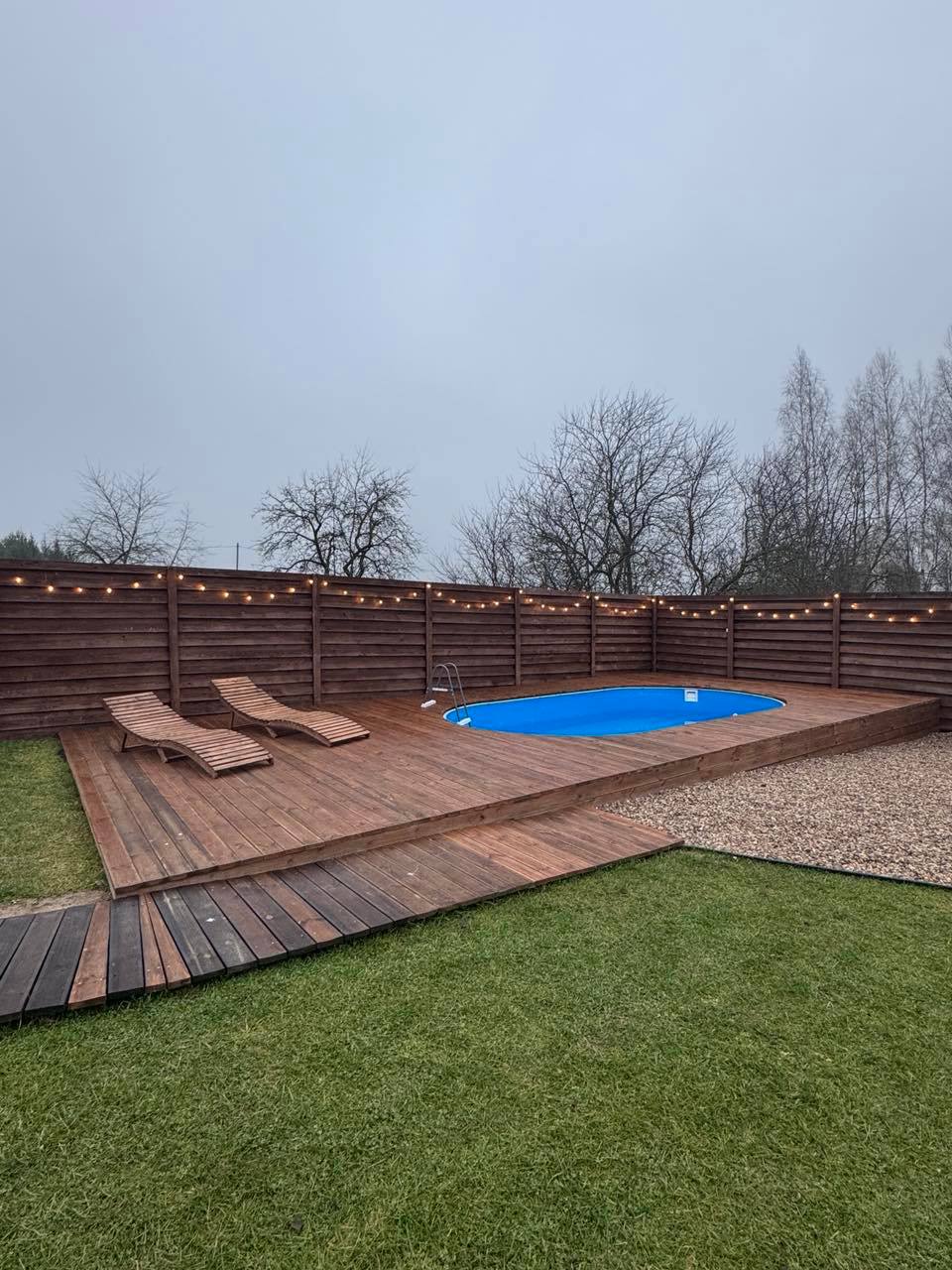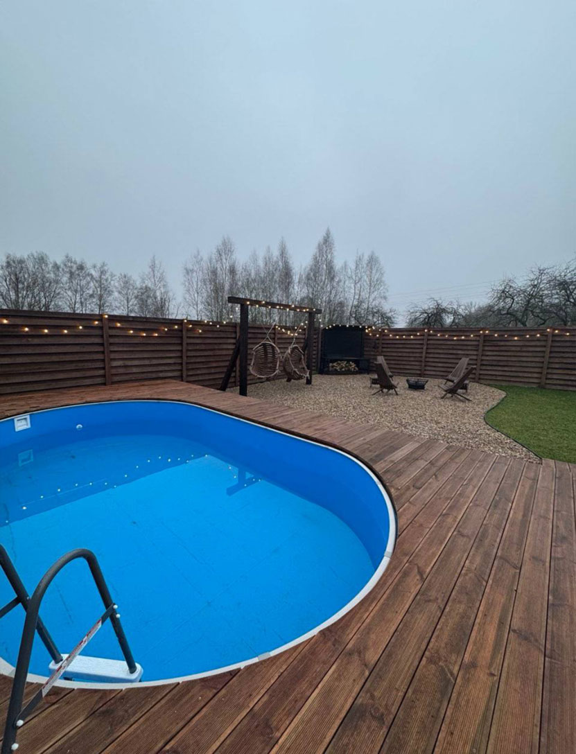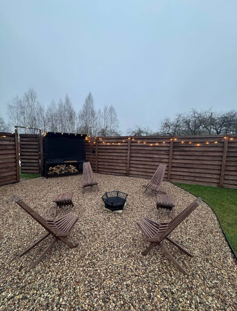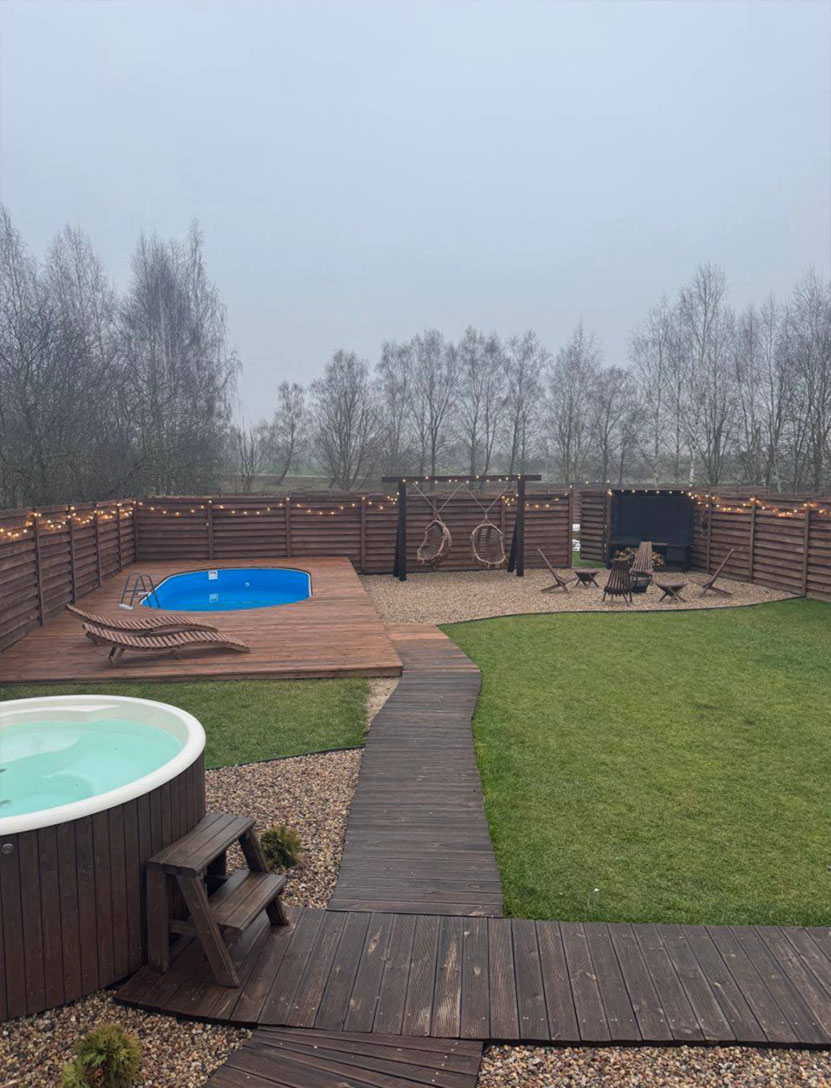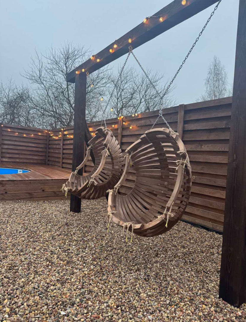 Территория дополняет впечатление: закрытый участок, мягкая подсветка, подвесные коконы и уютные зоны отдыха создают ту самую атмосферу загородного уюта.