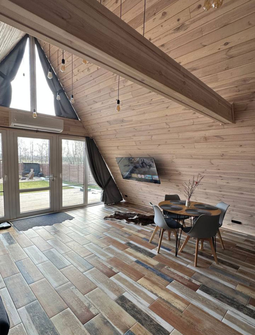 Внутри дом полностью адаптирован под комфортное проживание: кухня с техникой, кофемашина, посуда и базовые продукты, а также Wi-Fi, телевизор, кондиционер и тёплый пол. Благодаря этому аренда домика под Могилёвом становится максимально простой — можно приезжать налегке.